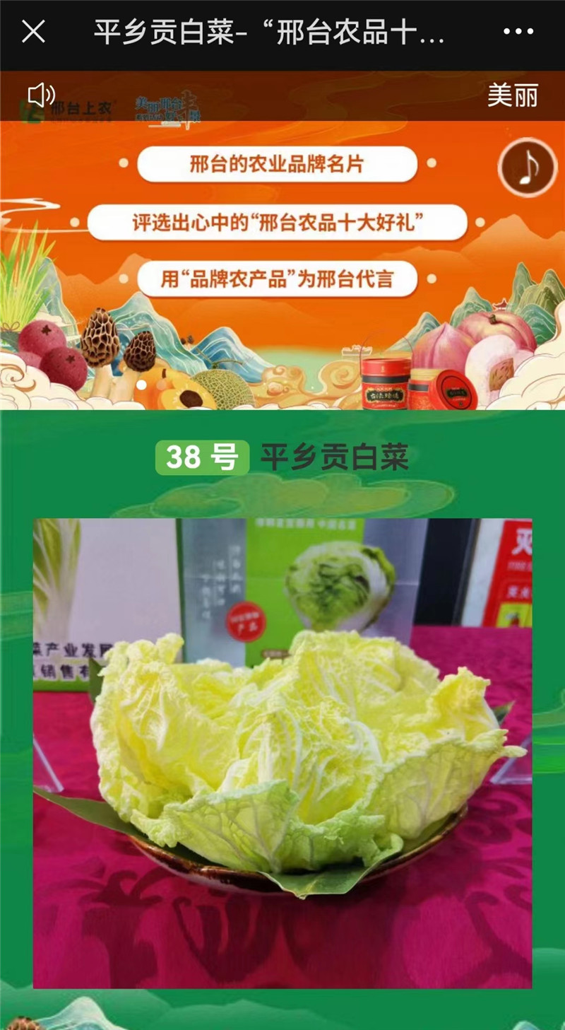 会上,对全市食品加工产业“一带五园”发展规划进行了重点推介;发布了“”邢台上农”品牌、“邢台农业十大好礼评选结果。平乡贡白菜、平乡桃入列“邢台上农品牌”;平乡贡白菜获:邢台农品十大好礼”殊荣。